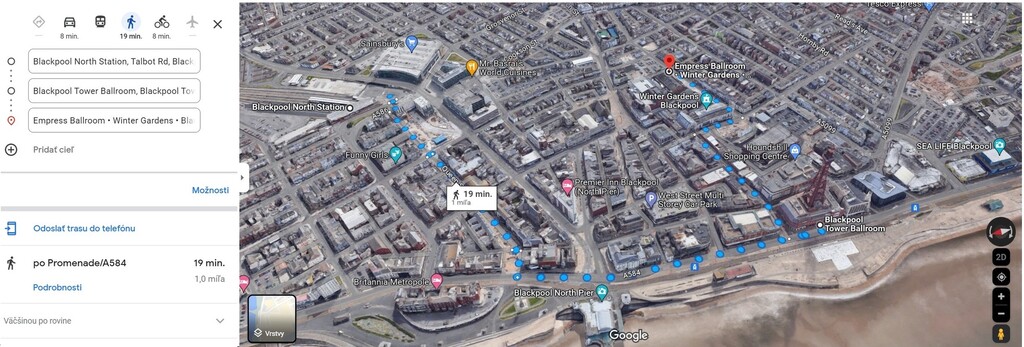 Tak sme pred štvrtou poobede dorazili vlakom do svetoznámeho prímorského letoviska Blackpool. Slávna tanečná sála Empress Ballroom Winter Gardens je odtiaľ necelý kilometer, ktorý sme hravo prešli peši po prímorskej promenáde. Bolo krásne jasno, asi desať stupňou nad nulou, od mora vial slabý, osviežujúci morský vetrík, slnko sa prevaľovalo tesne nad obzorom. Klasická scenéria ako z jednej časti detektívneho seriálu s Herculom Poirotom. Ibaže namiesto neho a jeho príťažlivej zrelej asistentky, slečny Lemonovej (ktorú z mne neznámych dôvodov vyťažoval iba pracovne), tu so mnou boli dve mladšie svetové extra triedy.