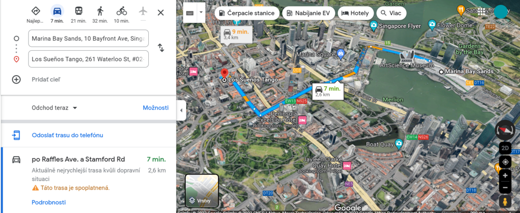 O jedenástej hodine sme začali byť trochu unavení, predsa len sme mali náročný deň, ja dokonca spojený s príletom. Rozhodli sme sa peši vrátiť na hotel, nakoľko Singapur v noci je prenádherný. Dámy však tie ich nové lodičky tlačili, tak sa vyzuli a po príjemne teplej vyhladenej dlažbe išli bosé. Ich krásne nalakované nechty na dlažbe priam svietili, bol to priam rozkošný pohľad. Užíval som si túto cestu. Bola to krásna a nezabudnuteľná prechádzka popri zátoke, kochali sme sa vysvietenými budovami, zrkadliacimi sa vo vodách zátoky. Všade bolo veľa ľudí, ktorí si tiež vychutnávali nočnú prechádzku. Prešli sme sa i slávnou OCBC Skyway s umelými vysvietenými gigantickými stromami. Cítili sme sa ako v pravekej džungli prvohôr.