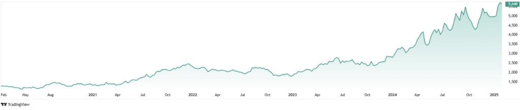 Vývoj cien priebežných kontraktov kávy Robusta za posledných 5 rokov. (Zdroj: TradingView)*