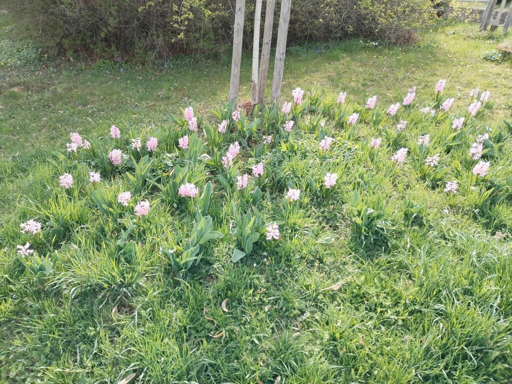 Smetánky lékařské (Taraxacum officinale), kvetoucí tulipány (Tulipa), dymnivky duté (Corydalis cava), sasanky hajní (Anemone nemorosa), orseje jarní (Ficaria verna), hyacinty východní (Hyacinthus orientalis) atd.