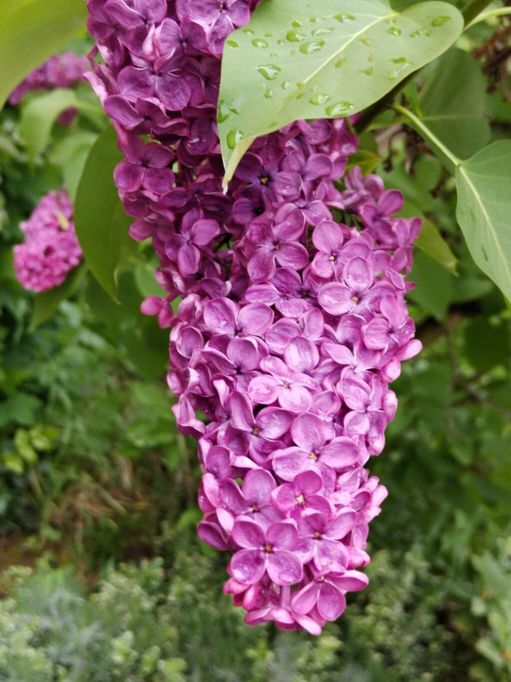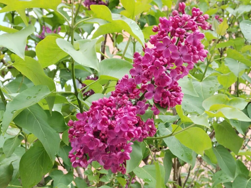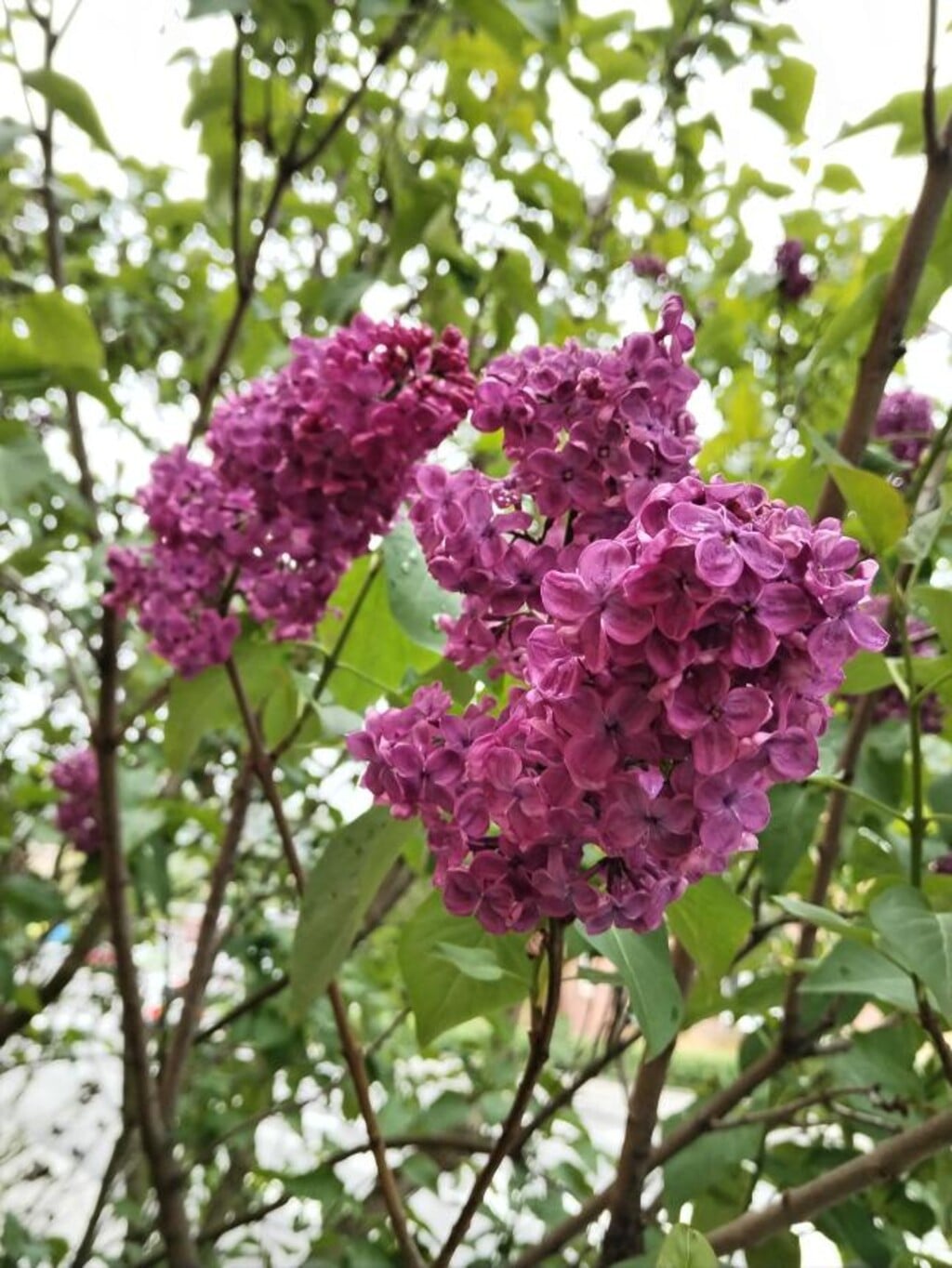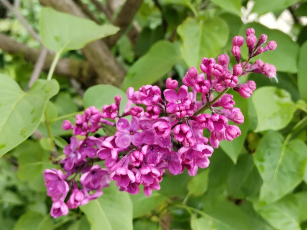 Jest pod mrakem, prší, též místy přestává pršet. Ve městě jsem vyfotil květy šeříku, který letos vykvetl dřív. Nádherně fialová barva květů splývá se zeleným olistěním.