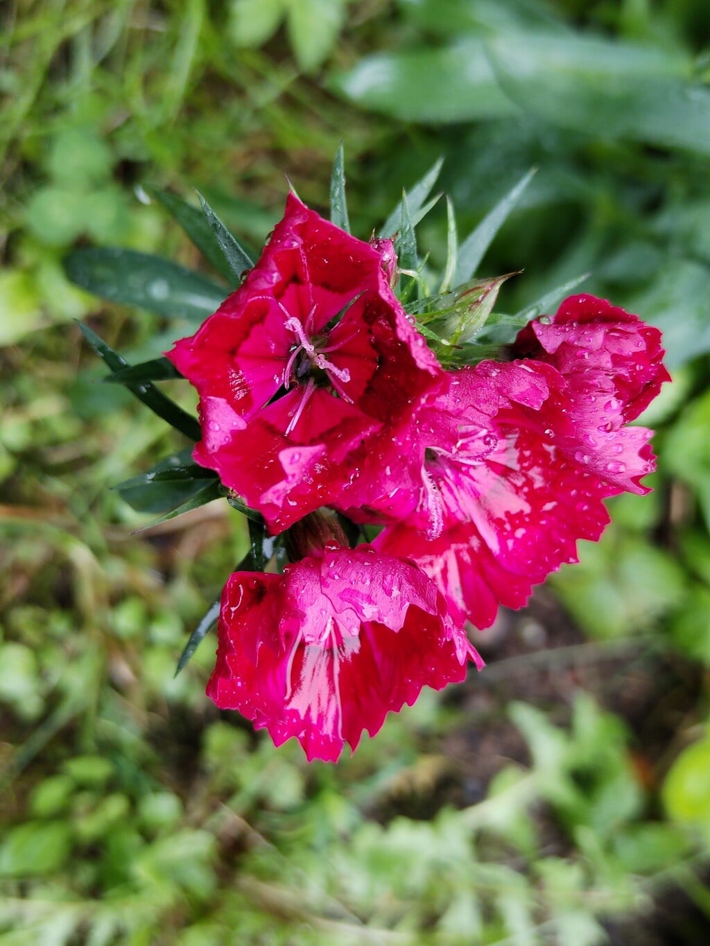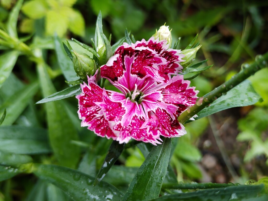 Rostou společně s růžemi, též letničkami. Ještě dopoledne pod mrakem a ponuro, a tak mi hvozdíky slouží jako povzbuzení, co se týče zahradních pohledů a krás. Jsou ozdobeny kapičkami deštivými.