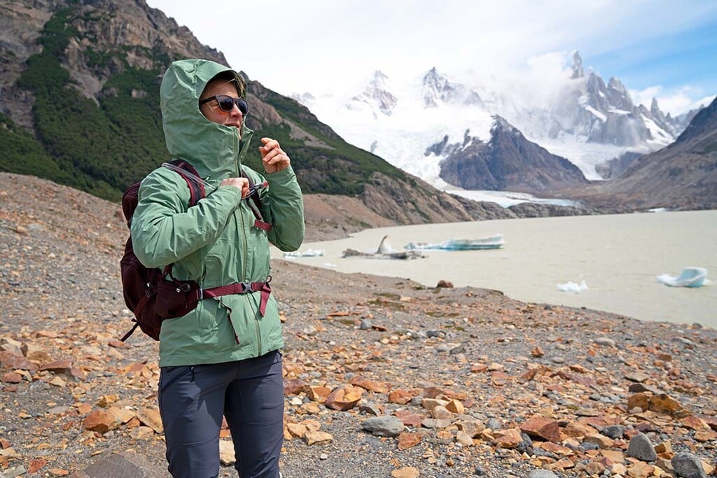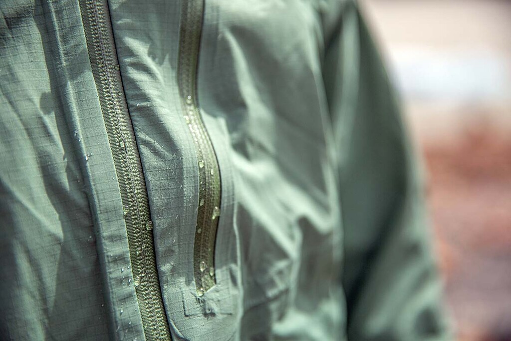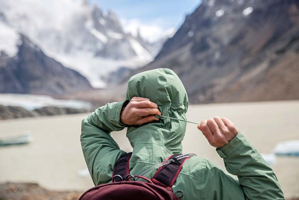 Naopak, keď príde vytúžená chvíľa a začne ťa bičovať dážď a vietor, zazipsuješ sa do kapucne na spôsob Kennyho zo South Parku. Tento štýl je neprekonateľný v tom, ako dôkladne ti ochráni hlavu, tvár a krk. Kapucňa má laminovaný šilt, aby bola v tom nečase stále ešte šanca niečo vidieť, a nastavuje sa sťahovacími lankami po stranách a vzadu - podľa toho, či máš pod ňou prilbu, čiapku, alebo len vlastnú hlavu. Zipsy sú proti premokaniu chránené buď klopou alebo laminovaním. Patagonia si dáva záležať na detailoch, ako je suchý zips na manžetách (už nikdy ti nenatečie do rukávov) a sťahovanie na spodku bundy. K nepremokavosti prispieva aj povrchová vodoodpudivá úprava, ktorá je na všetkých nových modeloch výlučne bez obsahu škodlivých PFC látok.