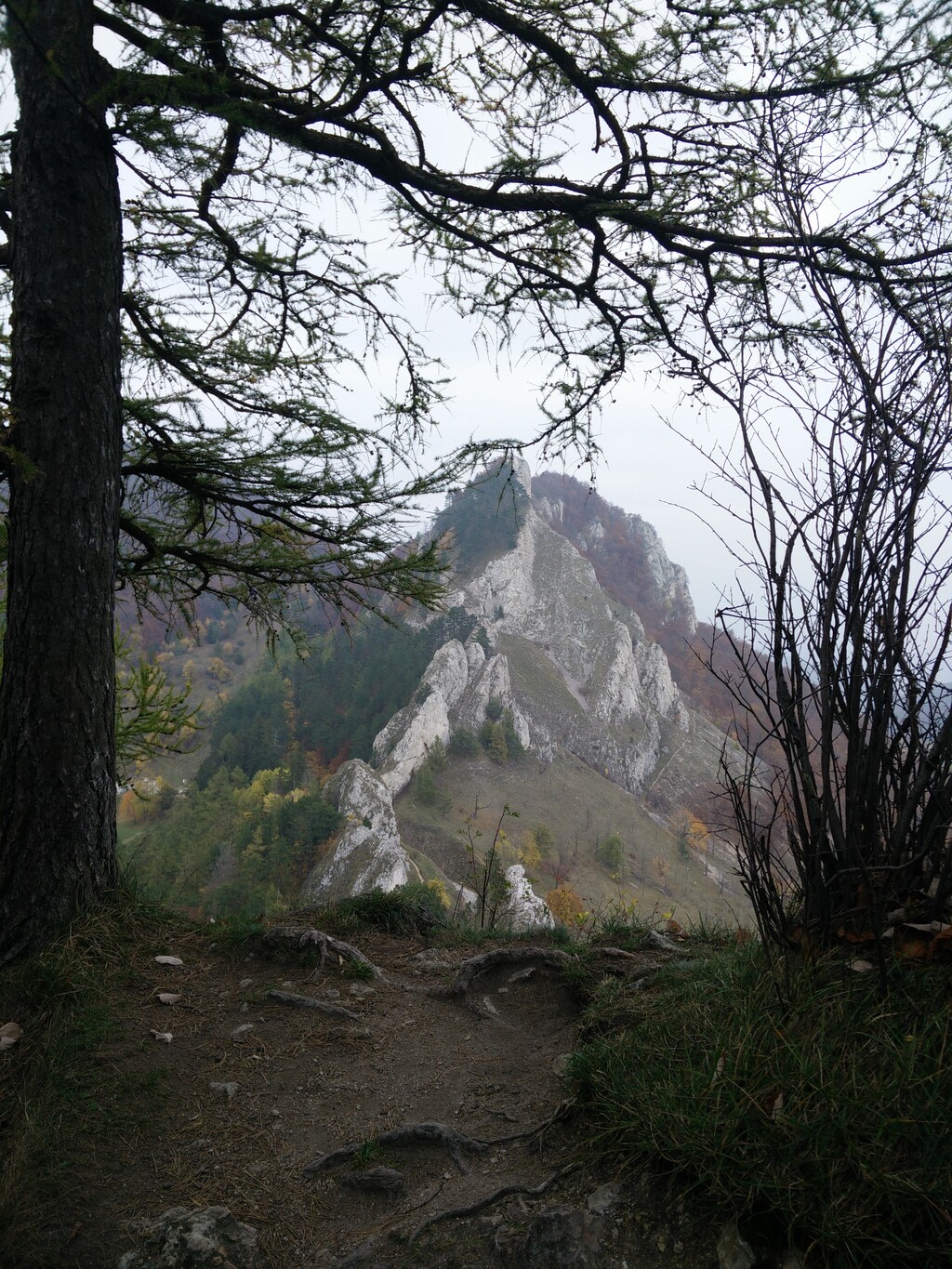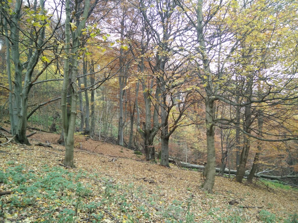 Hneď na začiatku cesty ideme do kopca po lesnej cestičke a nevieme sa vynadívať na výhľad okolo. Výhľad je tu naozaj hlavná devíza celej turistiky. Po cca 15-tich minútach sa dostávame na malú čistinku, odkiaľ nás značka vedie zas cestou dolu cez naozaj krásny farebný les. Chodník je prejazdný v pohode aj v teniskách, ale treba si dávať pozor na šmýkajúce sa lístie. Prechádzame krásnym bukovým lesom s kamennými prvkami, ktoré do lesa krásne zapadajú.