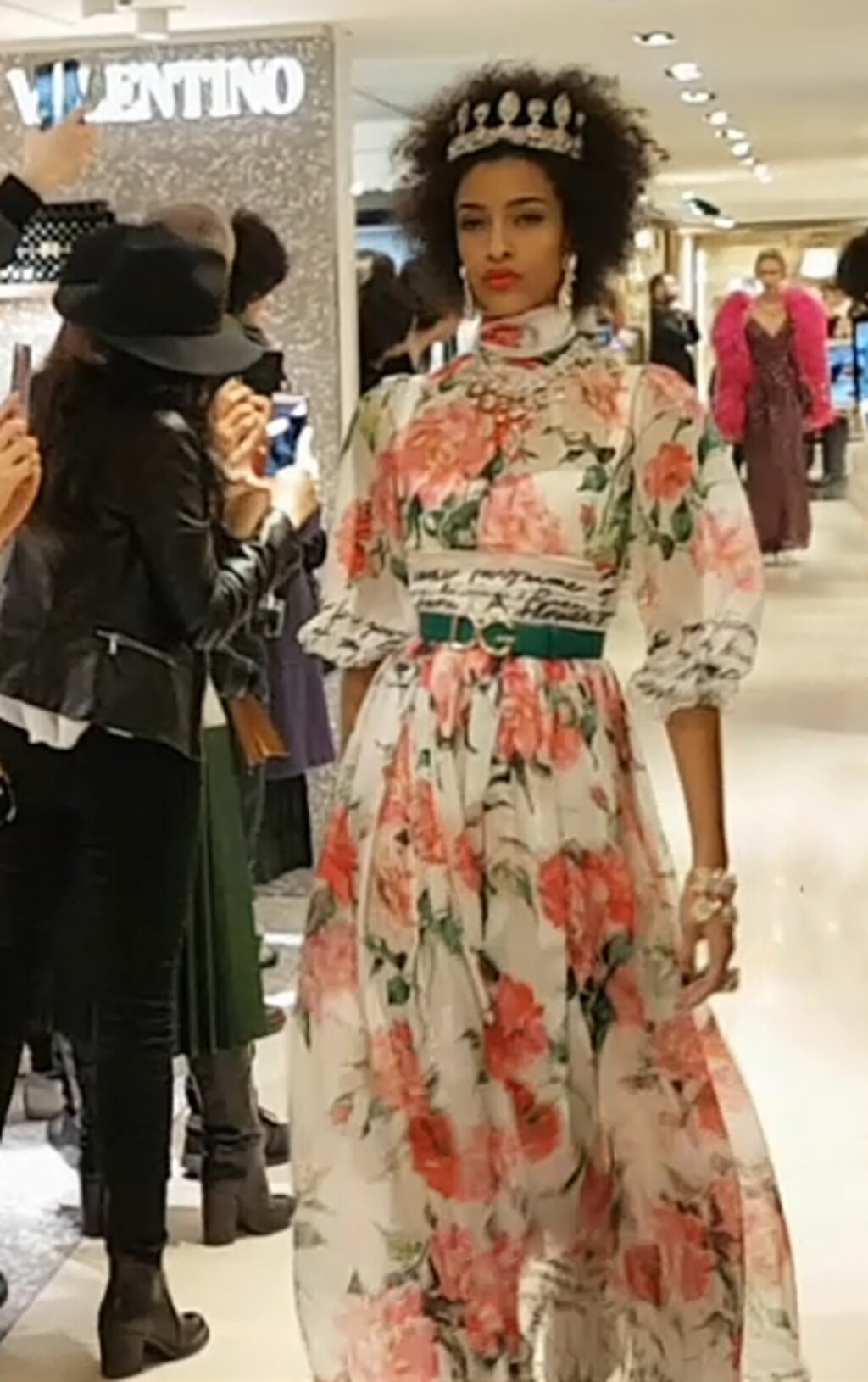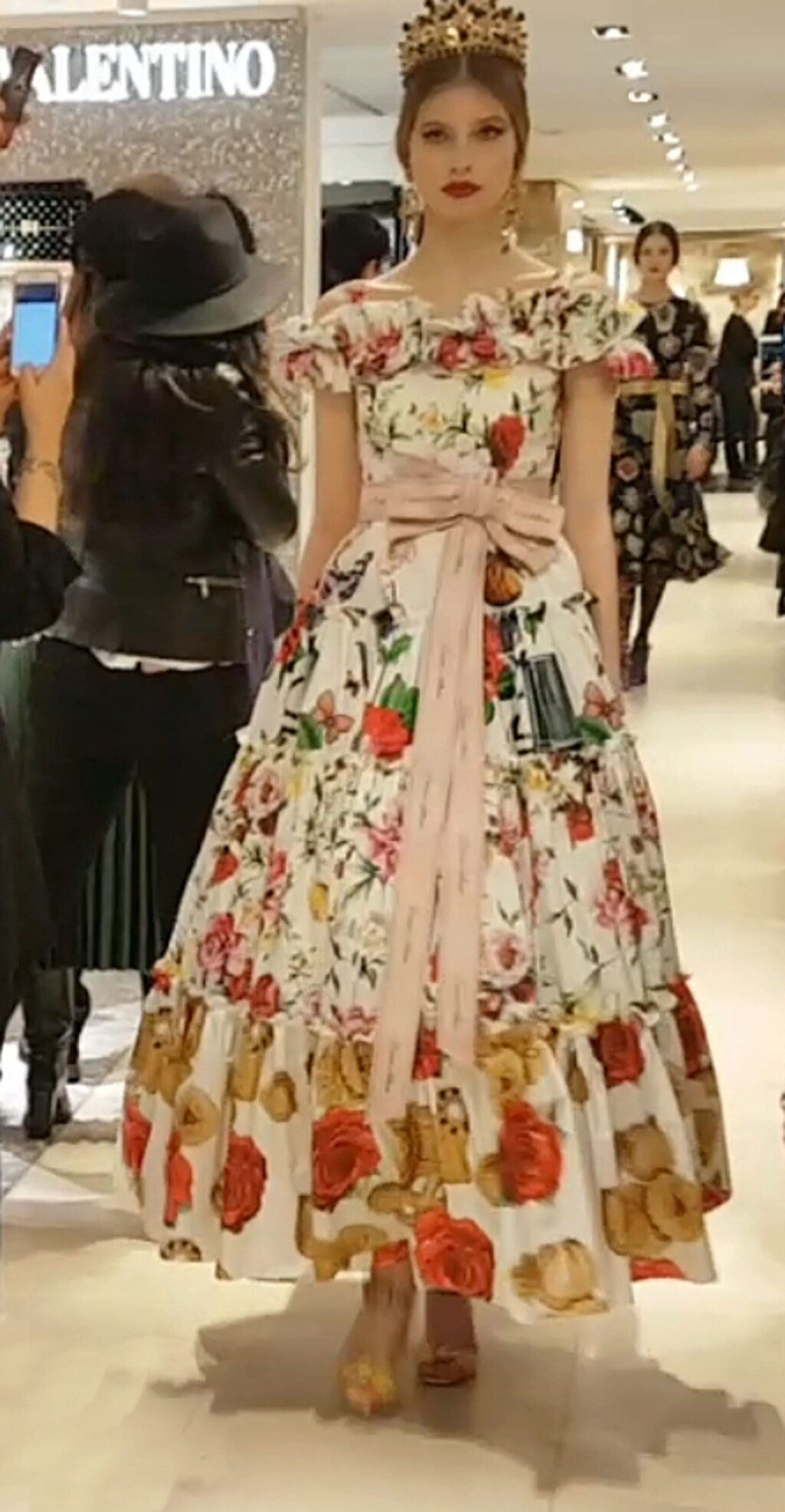 Módny maratón, čo možno nevedel každý, pod taktovkou tejto značky však pokračoval ďalej v známom nákupnom milánskom centre La Rinascente prehliadkou otvorenou pre verejnosť. Modelky predviedli po jednotlivých podlažiach voziac sa na eskalátoroch veľa prekrásnych ženských modelov, typicky Dolce and Gabbana štýlovo ladených – inšpirácia kostolmi – bohaté zdobenie, šaty s bohatými sukňami, korunky na hlavách, pompézne prepychové róby, zlato, kamienky, korunky. Niektoré modelky nevedia ale vôbec chodiť, niektoré majú neskutočne krivé nohy, jedna je maličká, ale to všetko nevadí, ponechanie reality prevyšuje neskutočný zážitok z prekrásnej show, ktorá roztancovala v závere aj samotné predavačky. Video módnej prehliadky - dlhá verzia je na mojom youtube kanáli mya mirell: