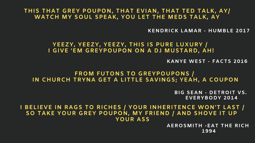 V súčasnej dekáde je Grey Poupon zmieňovaný veľmi často. S priemerom 9 trackov za rok. Okrem toho, že poupon je veľmi zaujímavé slovíčko v angličtine na rýmovanie, je tento produkt symbolom akéhosi luxusu a sociálneho statusu. Predsa nebudeš jesť párky s kremžskou horčicou, keď sedíš na vrchu sveta a máš na dijonskú horčicu, tsss.